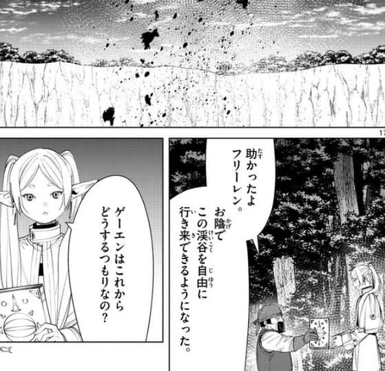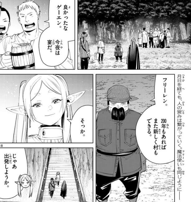 フリーレンはゲーエンにこれからどうするのか聞くと、ゲーエンは村でゆっくり老後を過ごすさ、と答えます。ゲーエンの村は昔、魔族に襲われてなくなっていると思っていたフリーレンは不思議そうな顔をしますが、ゲーエンの後ろでは村人が酒を片手に持って、今夜は宴だ、と嬉しそうに話しています。200年もあればまたあたし玖村もできる、とゲーエンはフリーレンに話すと、そっか、とフリーレンは笑顔で答えます。そして、フリーレン達は橋を渡って旅を再開します。