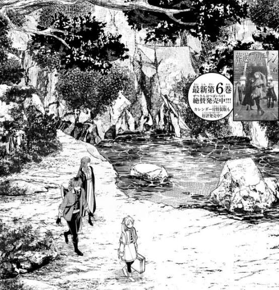 すると、フリーレンは何か心当たりがあるようで、とにかく上流を目指そうか、運が良ければ途中で渓谷を渡れるかも、とフリーレンは言うと、上流の方に歩き始めます。しばらく歩くと橋が見えてきます。