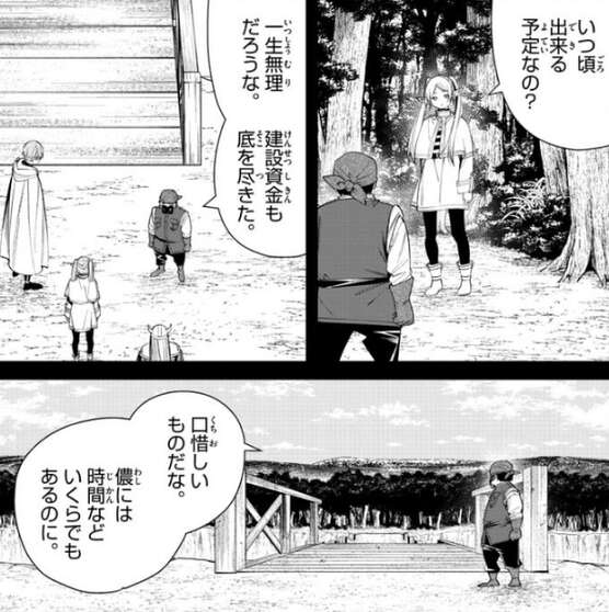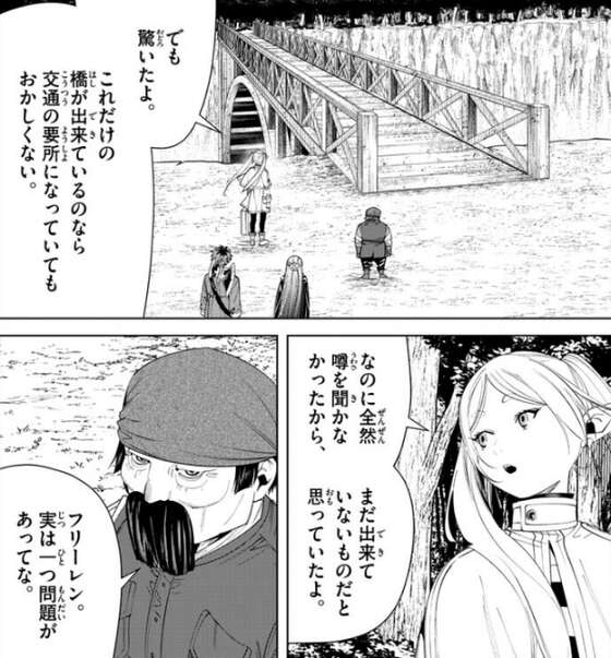 橋の入り口部分にはゲーエンというドワーフがいて、200年前からここに橋を作っているドワーフだ、とフリーレンから紹介されます。フリーレンは、これだけの端が出来ているのなら交通の要所になっていてもおかしくない、とゲーエンに言いますが、ゲーエンから実は一つ問題がある、と言われます。