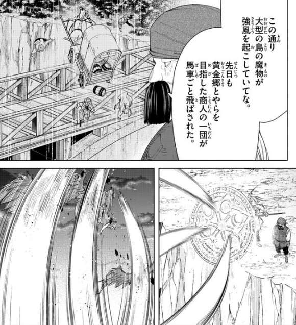 問題とは大型の鳥の魔物が強風を起こしている事で、先日も黄金郷を目指した商人の一団が馬車ごと飛ばされた、とゲーエンから聞かされます。フリーレンが大型の鳥の魔物を魔法で倒しますが、すぐに新しい鳥の魔物がやってきます。どうやら近くに大きな巣が出ているようで、倒してもいくらでも鳥の魔物はわいてくるようです。鳥の魔物のせいでこの橋が使い物にならん、とゲーエンは鳥の魔物の巣を何とかして欲しい、とフリーレンに頼みます。