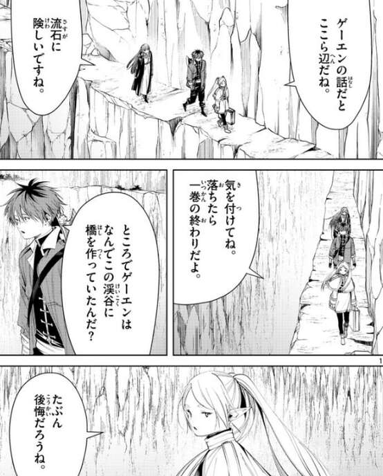 鳥の魔物の巣にフリーレン達は向かいますが、その途中でシュタルクはゲーエンがなんでこの渓谷に橋を作っているかをフリーレンに質問します。すると、後悔だろうね、とフリーレンはシュタルクに答えます。