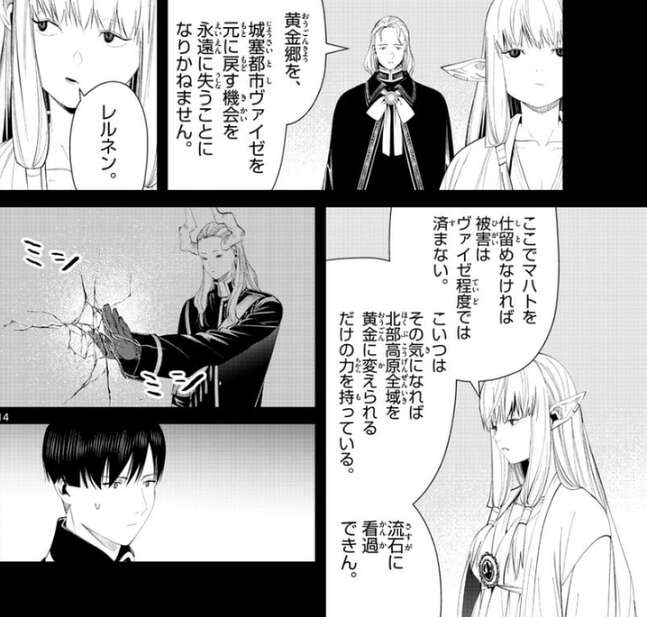 レルネン達は、マハトを殺せば万物を黄金に変える魔法(デイーアゴルゼ)も失伝し、城塞都市ヴァイゼを元に戻す機会を永遠に失ってしまう、と言い、ゼーリエを説得しようとします。しかしゼーリエは、ここでマハトを仕留めなければ被害はヴァイゼ程度では済まない、と言い、マハトはその気になれば北部高原全域を黄金に変えられるだけの力を持っている、流石に看過できん、とゼーリエの部下たちに言います。