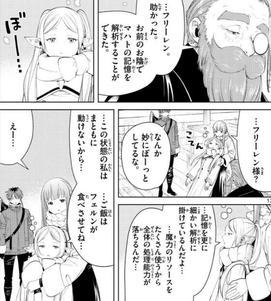 こうして大陸魔法協会はマハトを大結界でマハトを封印しますが、ヴァイゼは黄金郷のままです。マハトの記憶を解析したフリーレンは、更に細かい解析を掛けようとしますが、魔力のリソースをたくさん使うようで、まともに動けません。フリーレンはフェルンに、まともに動けないから、ご飯はフェルンが食べさせてね…、とお願いしますが、フェルンは、えー…、とフリーレンに抗議します。さらに着替えとお風呂と髪結びも手伝ってね、とフリーレンは言いますが、ほぼいつも通りじゃないですか、とフェルンは言おうとします。