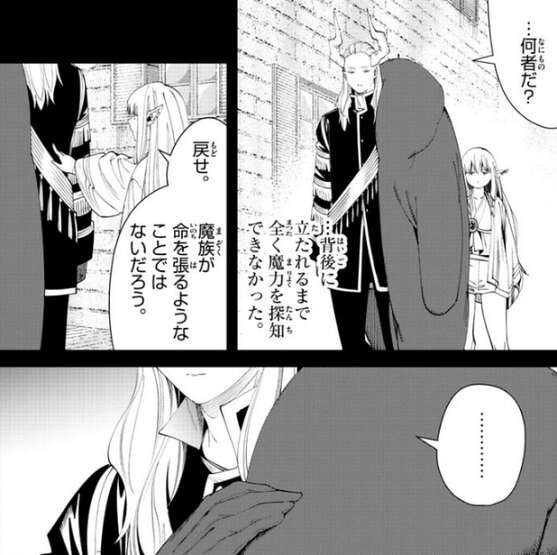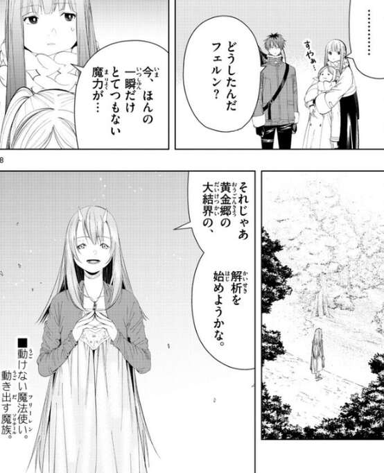 フェルンは誰かの魔力を察知したようで、すやぁ…、と寝ているフリーレンを抱きかかえながら、周囲の様子を探ります。一方、離れた場所にいるソリテールは、黄金郷の大結界の解析を始めようとしています。