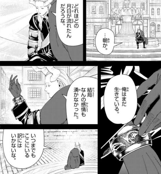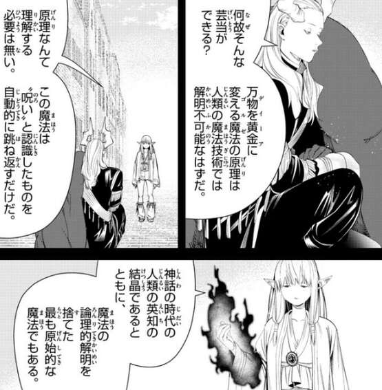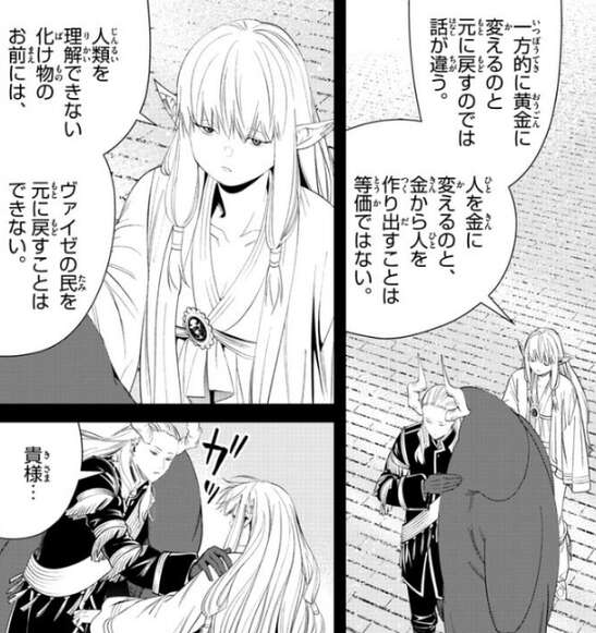 黄金を変えるのは不可逆のようで、金から人に戻すのは無理だとゼーリエは分かり、ヴァイゼの民を元に戻すことは出来ない、とゼーリエはマハトに言います。すると、マハトはゼーリエの肩を掴もうとします。