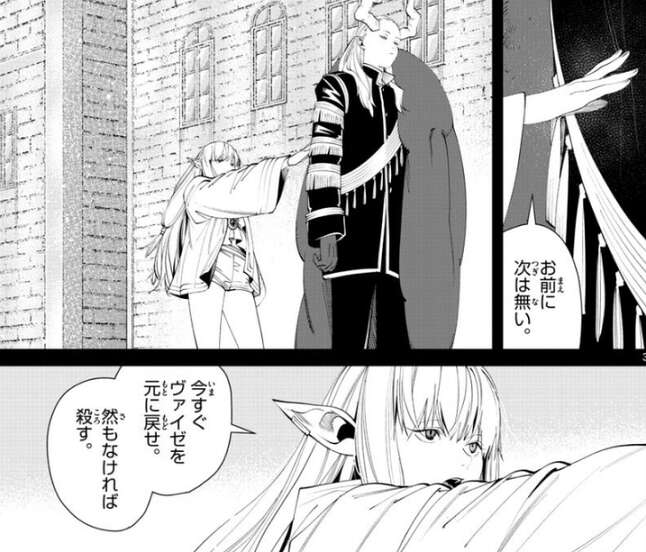 ゼーリエはマハトに、今すぐヴァイゼを元に戻せ、と言いますが、マハトはゼーリエの言う事には答えずゼーリエの様子を伺います。