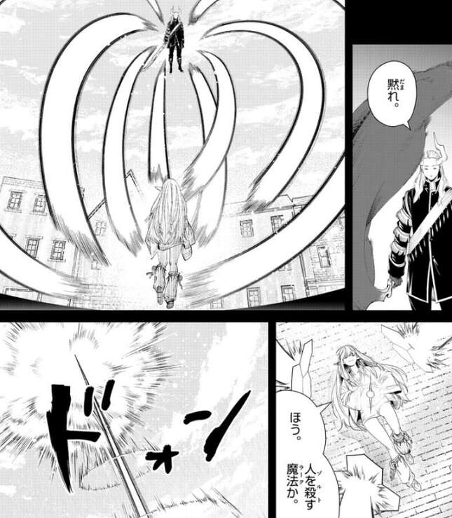 マハトは人を殺す魔法(ゾルトラーク)でゼーリエを攻撃しますが、ゼーリエはマハトの魔法を防ぐと、魔法でマハトをさらに攻撃します。しかし、マハトも防御魔法でゼーリエの魔法攻撃を防ぎます。