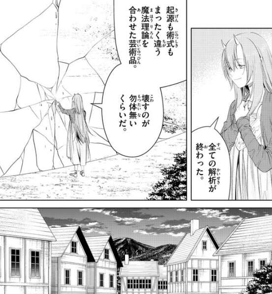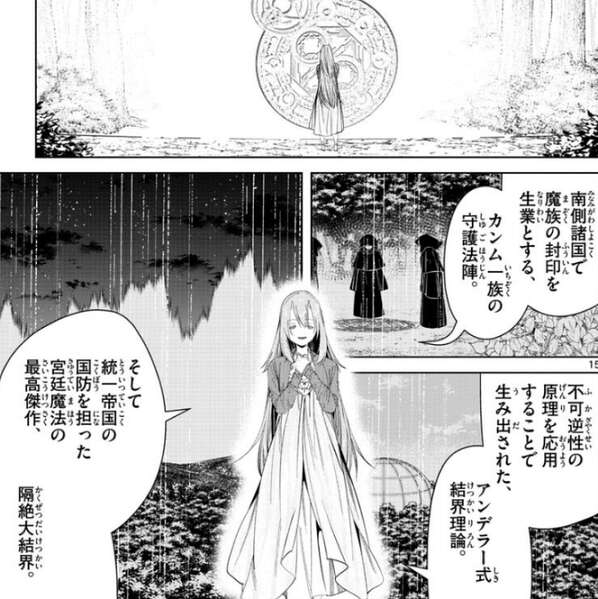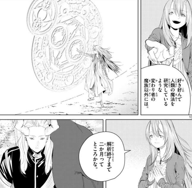 大結界に触れたソリテールは、この結界が人類の様々な国や民族の魔法理論が組み合わされている、複数の人類の偉大な魔法使いによって生み出された、偉大な結晶だという事を理解します。そして、この大結界は魔法理論の知識が無ければ決して紐解けず、魔族にはこの大結界は破れないとつぶやきます。そして、好き好んで人類の魔法を研究してるような変わり者の魔族以外には、とつぶやくと、ソリテールは大結界の解析を本格的に始めます。解析終了まで二か月かかるとソリテールは言い、それはフリーレンのマハトの記憶の解析が終わる頃と同時期になります。