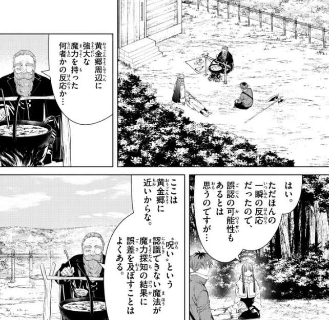 ソリテールが大結界の解析を始めた頃、フェルンは黄金郷周辺で強大な魔力の反応を探知していました。しかしほんの一瞬の反応だったことや、黄金郷の“呪い”という認識できない魔法が魔力探知の結果に誤差を及ぼした可能性を考えて、デンケンは魔力探知の誤認と考えます。しかし、デンケンは警戒するに越したことはないと、フリーレン達に警戒するように促します。
