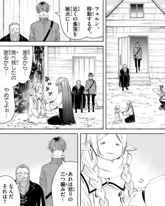 デンケンはフリーレン達の旅の足止めをしてしまった、と謝りますが、フリーレンと旅をしているとこの程度の足止めは日常茶飯事だと、フェルンとシュタルクは言い、気にしないようにデンケンに言います。そして、管理者の小屋にはベッドも何もなく、二か月を過ごすことは厳しいので、近くにあるここら辺では唯一の集落に拠点を移すことにします。フリーレンとフェルンに拠点を移すことをシュタルクは伝えようとしますが、フェルンはフリーレンが野菜を食べ残したことに静かに怒っていて、怒りの三つ編みをフリーレンにしている最中でした。