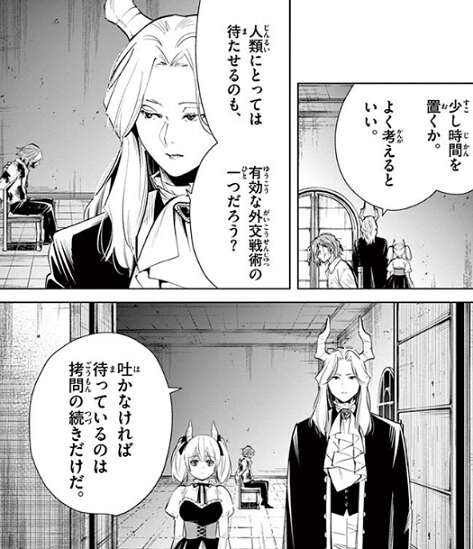 魔族を倒そうとフェルンとシュタルクはグラナト伯爵の館に忍び込みます。リュグナーはグラナト伯爵との交渉が決裂してしまい、拷問をしてグラナト家が管理している防護結界を操作する魔法を聞き出そうとします。拷問の後魔族からよく考えるのようにと言われ、グラナト伯爵は椅子に拘束されたまま放置されますが、そこに館に忍び込んでいたシュタルクが現れます。