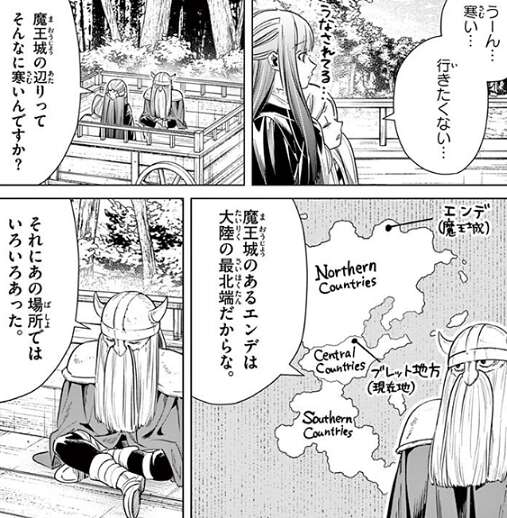 アイゼンから、魂の眠る地(オレオール)を探してヒンメルと話すんだ、とフリーレンは頼まれます。どうせ当てのない旅だ、とフリーレンは言いアイゼンの頼みを引き受けます。フリーレン達は魔王城のあるエンデを目指しますが、エンデは大陸の最北端に位置する場所でフリーレンが夢で、うーん…寒い…行きたくない…、とうなされるくらい、寒い場所のようです。