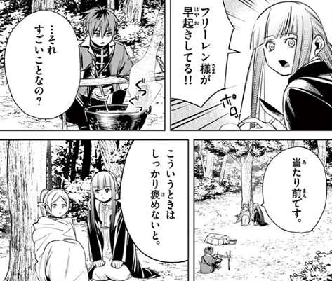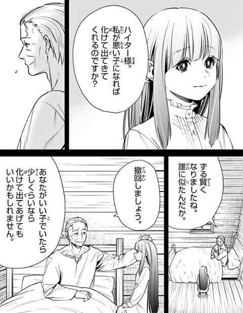 フェルンは馬車で移動しながら寝てしまい、まだハイターが生きていた頃の夢を見ます。ハイターから、これからはフリーレンの言うことをよく聞いていい子にするように言われ、いい子にしないと死んだ後に化けて出ます、とフェルンは言われます。すると、フェルンは、私が悪い子になれば化けて出てきてくれるのですか?と、少し意地の悪い質問をハイターにします。