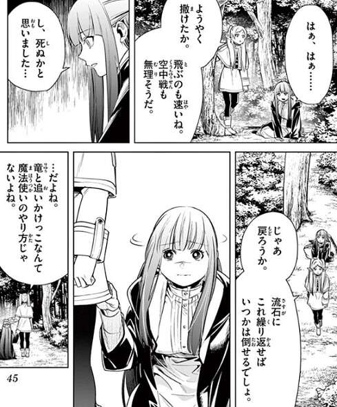フリーレン達はリーゲル峡谷で紅鏡竜とその巣を見つけます。紅鏡竜の巣には、フリーレンが探していた魔導書があり、フリーレンはフェルンの魔法で紅鏡竜を仕留めようとします。しかし、フェルンの魔法による攻撃はあまり手応えがなく、紅鏡竜はすぐにフリーレン達を襲います。初めて見た竜に襲われ逃げるので精一杯だったフェルンは、戦意を喪失してしまいます。
