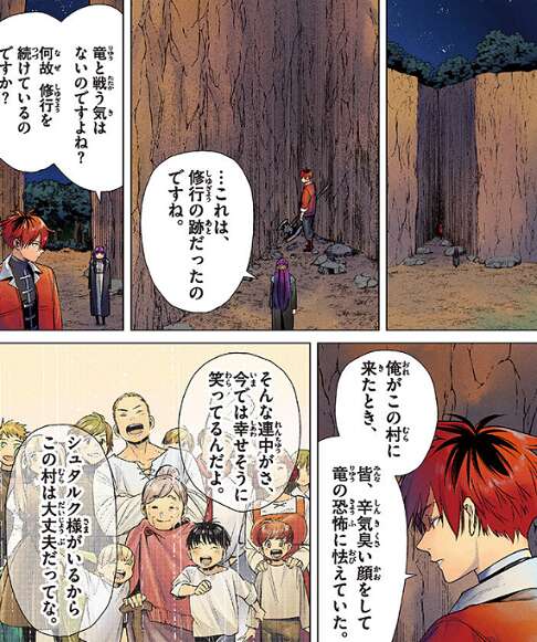 フリーレンに言われるまま、フェルンは音のする方に行ってみるとシュタルクが修行をしてます。崖の削られた後は、シュタルクの修行の後でした。シュタルクは臆病で竜と戦う気は全くなさそうでしたが、何故修行を続けているのか、フェルンはシュタルクに質問します。すると、シュタルクがこの村に来たとき、皆辛気臭い顔をして竜の恐怖におびえていたと言います。しかし、今では幸せそうに笑っているんだよ、シュタルク様がいるからこの村は大丈夫だってな、と言いこの村の英雄シュタルクだから、俺が守らなきゃならないんだよ、とシュタルクはこの村を守る理由を話します。