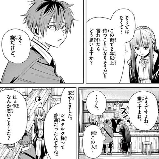 アイゼンの弟子・シュタルクを仲間に迎えて、北を目指して旅をしていたフリーレン達ですが、北側諸国は魔物の動きが活発なようで関所の通行が認められません。フリーレンは久々にゆっくり魔法の研究ができる、と喜んでいますが、フェルンが街で聞いた噂話だと関所が開くのは早くても2年は先になりそうです。エルフのフリーレンは長寿なので2年先でも全く気にせず、フェルンとシュタルクで関所を超える方法がないか、街を聞いて回ります。
