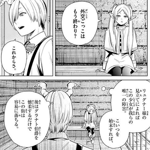 グラナト伯爵は10年前に断頭台のアウラとの戦いで息子を亡くしており、魔族との和睦をどうするか迷っていました。リュグナーは交渉でグラナト伯爵の人情に厚い部分に訴え、和睦と称してこの街の防護結界を解除させようとします。一方、断頭台のアウラの配下、ドラートは唯一の障害となりそうなフリーレンを殺そうと、牢にいるフリーレンを襲撃します。