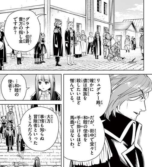 北側諸国グラナト伯爵領の街に入ったフリーレン達は、衛兵が多いことを気にしていると、フリーレンが突然、杖を構えます。フェルンが慌てて街中ですよ、と注意していると、魔族だ、とフリーレンは言い、魔族を魔法で攻撃しようとし衛兵に取り押さえられます。魔族はリュグナーと呼ばれていて、和睦の使者としてこの街を訪れていました。