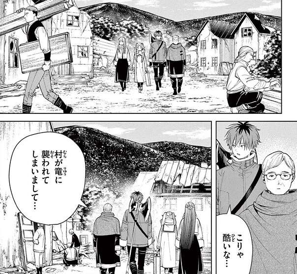 レヴォルテ達、魔族の集団を討伐したフリーレン達は、ゲナウ、メトーデと別れると、北部高原、ドラッヘ地方へと進みます。フリーレン達はドラッヘ地方の村に立ち寄ると、村は竜の群れに襲われて、甚大な被害を遭っていました。竜の群れは近くに棲み着いていて、フリーレン達は竜の群れの討伐依頼を受けます。