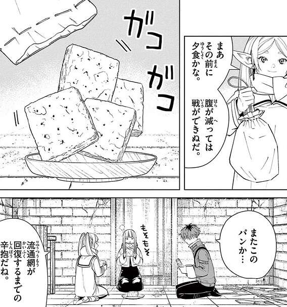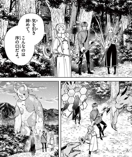フリーレン達は北側諸国、ナーハリヒト地方にある関所に到着、この関所を抜けるといよいよ北部高原です。関所を抜けて北部高原に入るといきなり魔物の群れに襲われてしまい、いきなり三日三晩気が抜けない状況になってしまいます。その後、集落に到着すると、その集落の住人から街道に出没する魔物の討伐依頼を受けます。