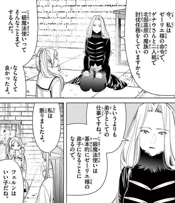 ゲナウとメトーデは、ゼーリエの命令で北部高原の魔族の討伐任務することになりましたが、一級魔法使いはそんなことまでするんだ、とフリーレンは言いメトーデに同情します。しかし、一級魔法使いになった者は基本的にゼーリエの弟子になっているので、ゼーリエからの命令には従わないといけないようです。