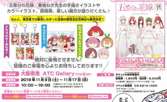 次は11月9日からの大阪会場でお会いしましょう!#五等分の花嫁 #五等分の花嫁展 pic.twitter.com/cTAJuFveL7— 五等分の花嫁展【公式】 (@5Hanayome_ten) September 1, 2019
