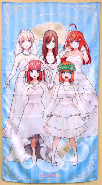 ウエディング姿の五つ子たちが描かれたクロスです。正確なサイズは今のところ不明ですが、値段が高いのでそれなりに大きいと思います。部屋に飾ったりと、いろいろ使い道はあると思います。