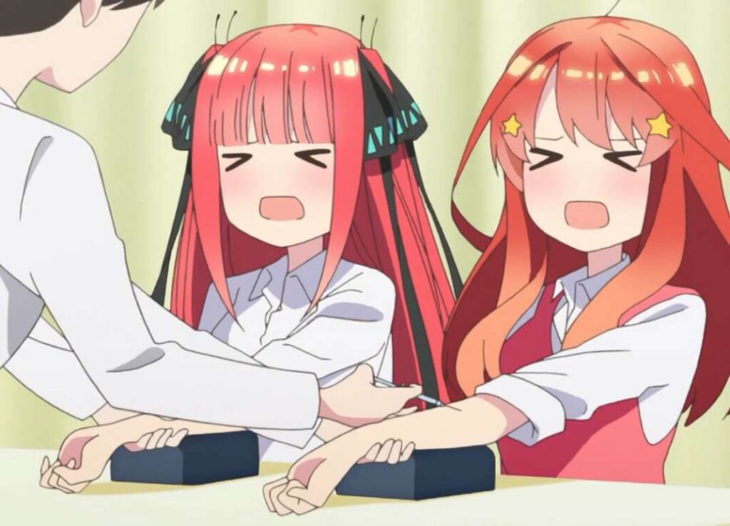 五月が風太郎にお守りを見せた後、二乃と五月が諦めて予防注射を受けます。