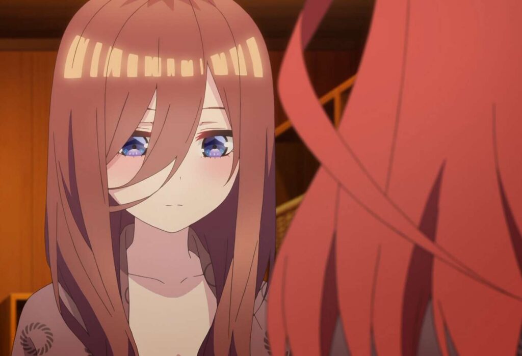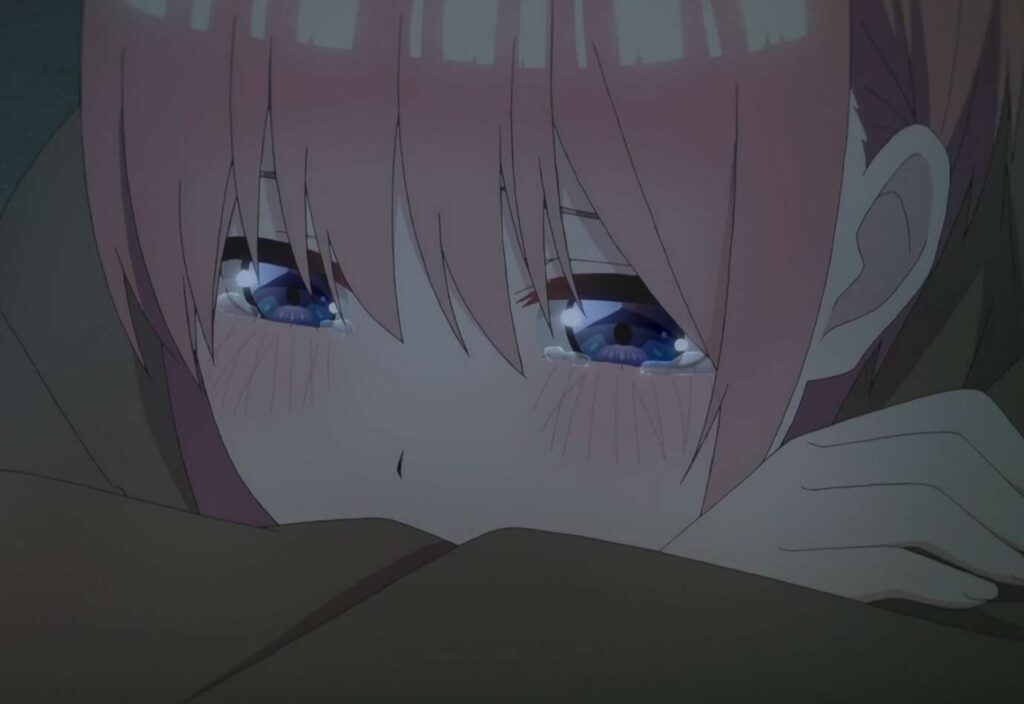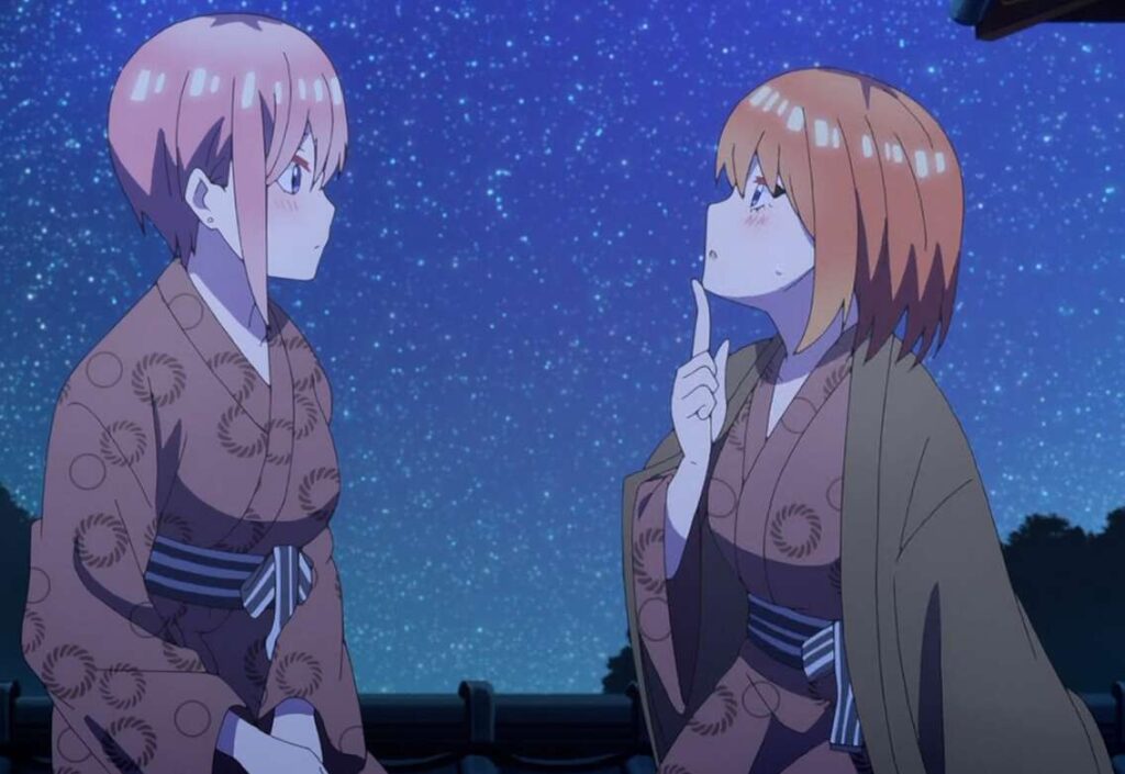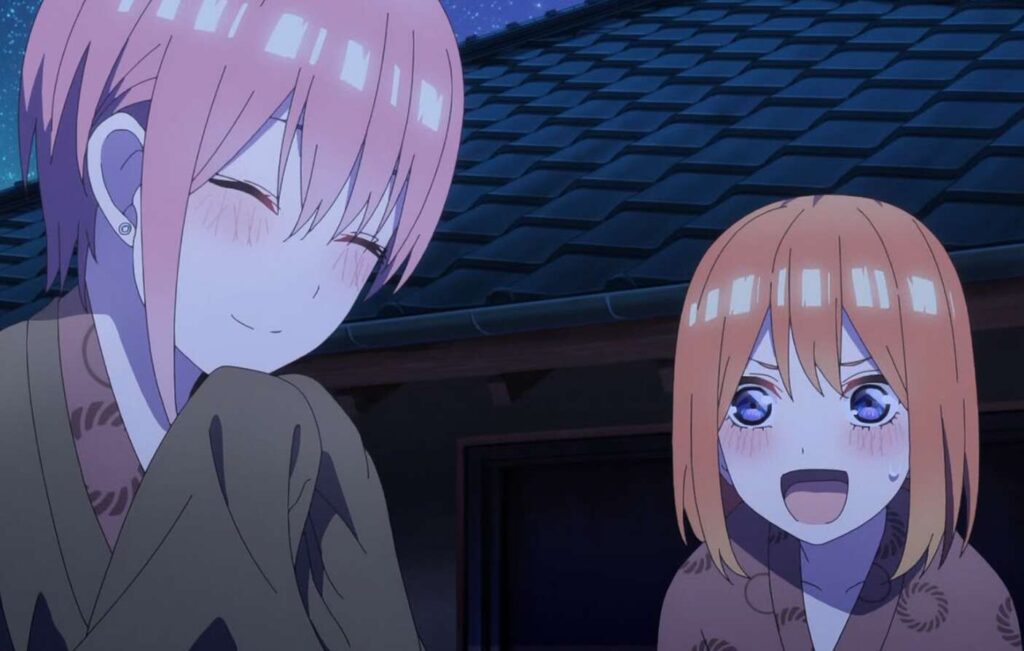 四葉に励まされ、あらためて一花は自分のしたい事を考え、誰にも取られたくなかったと言います。自分のしたいことに気付いた一花は笑顔になり、四葉に部屋に戻ろうと言います。