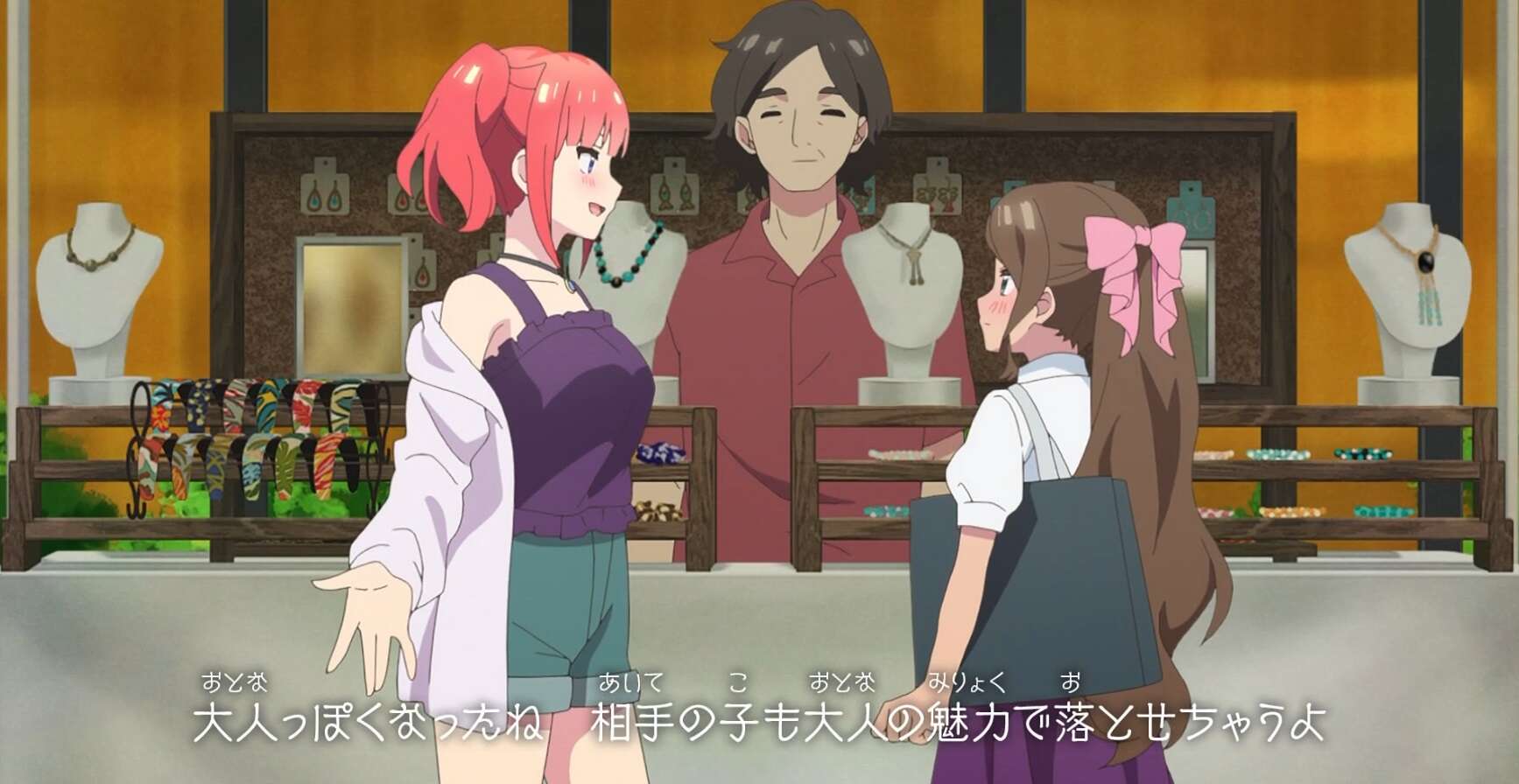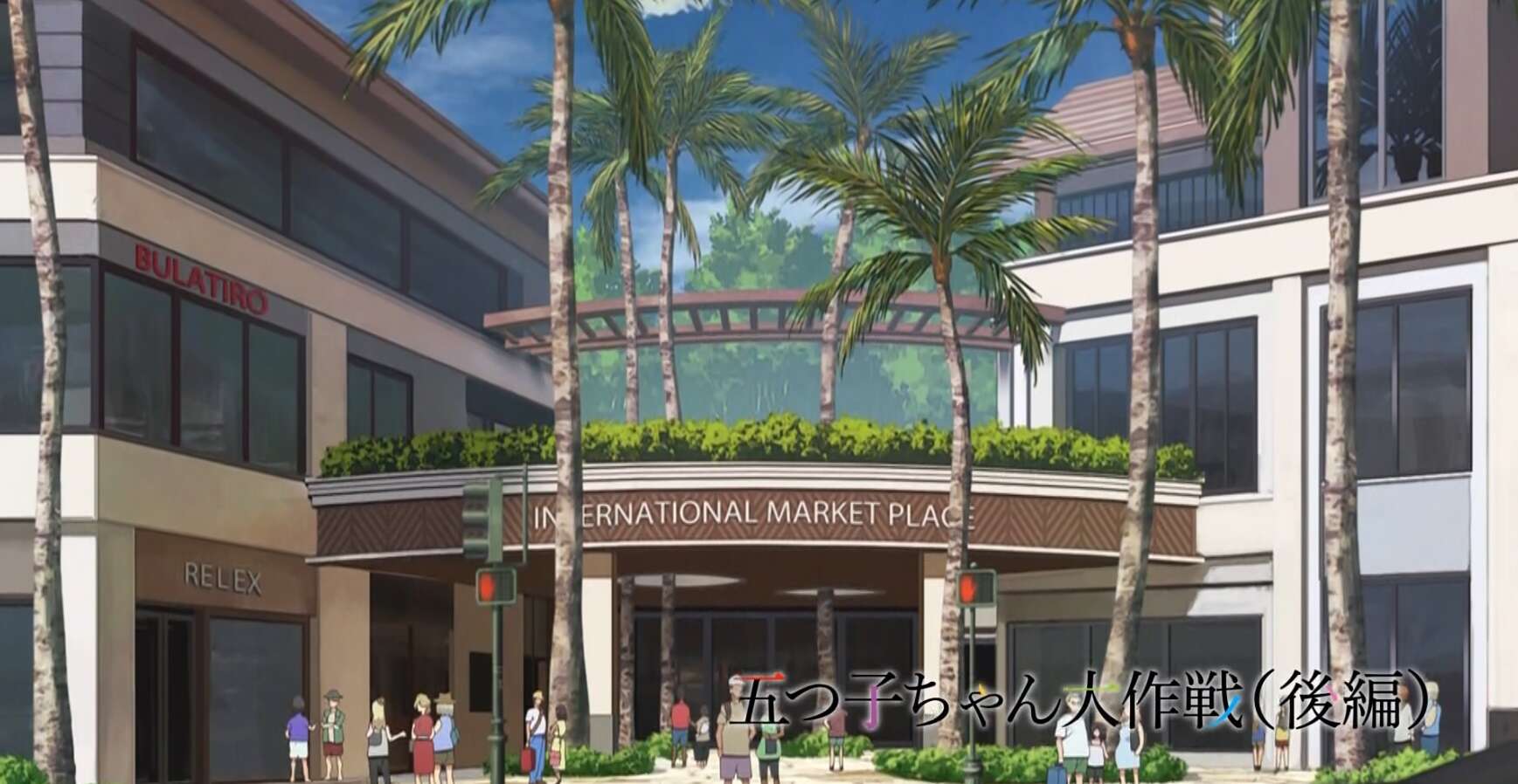 次は一花がリリーとの買い物に付き合い、アクセサリーなどを選んであげます。途中、有名人の一花はハワイの複数のファンに中野一花だとバレてしまい、仕方なく一花は身を隠します。次に二乃に変装した三玖がリリーに、日本語の勉強をしようと言い、リリーとお茶をします。