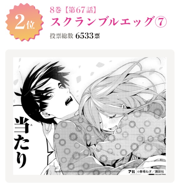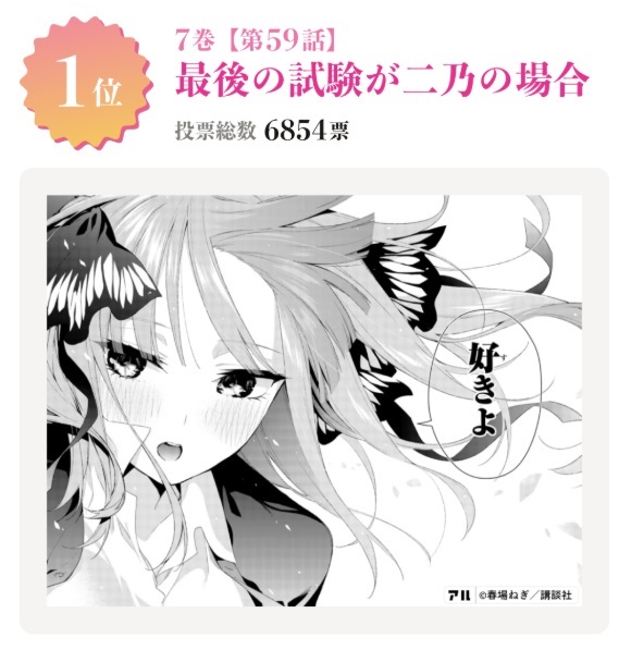「五等分の花嫁エピソード総選挙」の結果発表です! どのエピソードが人気だったのか…下記リンクから是非チェックしていただけると嬉しいです!! 改めまして、沢山のご投票・ご協力ありがとうございました!!! #五等分の花嫁https://t.co/fSTk9pRtMd— 五等分の花嫁【公式】 (@5Hanayome) June 13, 2020