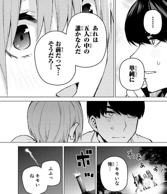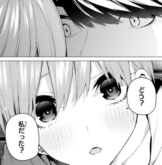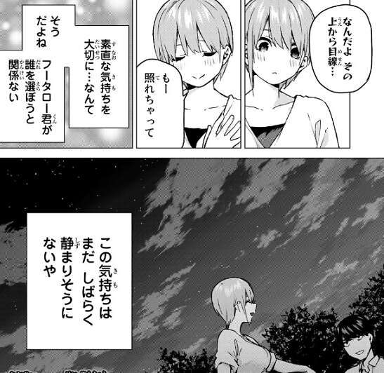 一花を見つめていると、一花は起きていたようで、急に目を開けて唇を見てたでしょと風太郎は言います。一花からなんで見てたのかと言われ、風太郎は五人の中の誰かなら、お前だって、そうだろ、と誰だったら嬉しいかの質問に、一花の事を気にしていたと風太郎は明かします。