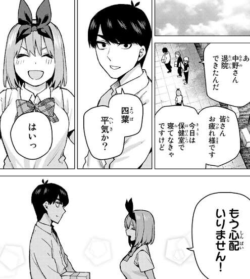 その後は再び笑顔になり風太郎たちと合流します。今日は保健室で寝てなきゃいけないが、もう心配いりません!と笑顔で風太郎にこたえます。結局、一花たち三人とは違い、四葉は風太郎に分かるようにキスをすることなく終わります。