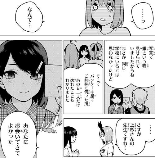 竹林は六年前に京都で風太郎と会ったのは、四葉だと言い当てます。パンケーキ屋で二乃と五月から話を聞き、四葉だと推測したようです。竹林は四葉に会えて良かったと言いこの事は風太郎に言っているのかと聞こうとしますが、四葉は秘密にして欲しいと訴えます。竹林が理由を聞くと、風太郎は五年間正しく努力したのに、自分は無駄なことに執着した意味のない五年間だった、だから風太郎にがっかりされたくないからだと四葉は言います。