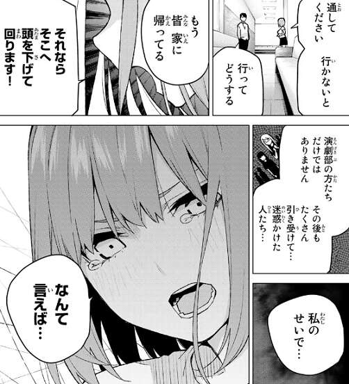 四葉は誰の役にも立てず自分のいる意味に悩みながら歩いていると、病院に来ていた風太郎と会います。演劇部やお手伝いを引き受けながら手伝えなかった四葉は、皆に頭を下げて回ると言います。自分のせいで迷惑をかけた人たちに、なんて言えば…、と四葉は涙目になりうつむいてしまいます。