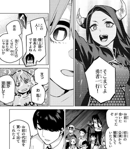 風太郎はどうしても行こうとする四葉に、明日まで絶対安静だから通せないと言い、四葉が倒れた後のことをまずは話そうとします。四葉が過労で倒れたことを演劇部に説明し風太郎が代わりに謝罪すると、演劇部の皆は四葉がそこまで溜め込んでいたのを気づけなかった自分達も悪かったと言います。しかし四葉の代役を探すのは難しいと話していましたが、結果的に初日の公演から観覧していた陸上部の部長が代役をする形で、演劇部の公演は二日目も行うことが出来ました。公演の初日、陸上部の部長がカメラで撮影していますが、近くに勇也らしき人物も見えます。実はらいは達の近くに陸上部の部長もいたようですね。