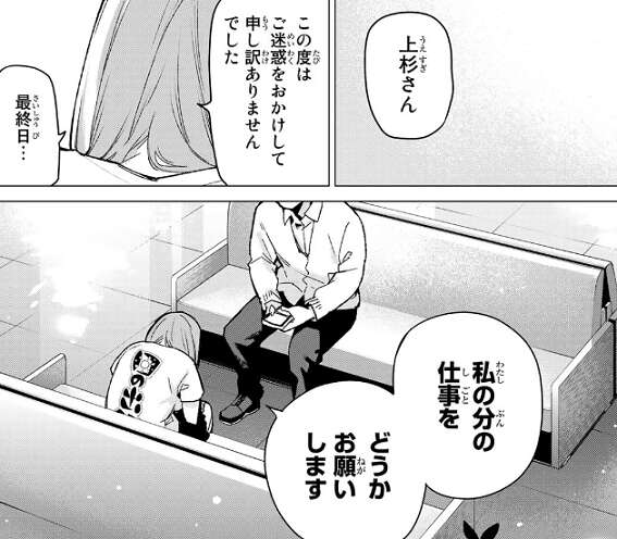 前回、四葉は過労で倒れてしまい病院に運ばれてしまいましたが、四葉は自分の仕事に穴を開けてしまい、自分を責めます。しかし、皆が四葉の抜けた穴を助け合ってフォローしてくれている事を風太郎から聞き、四葉は無理をせず自分の仕事を皆にお願いします。