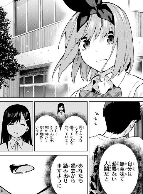 そして四葉は最終日、助けてくれた皆に頭を下げて誤って回ります。そしてその後風太郎の所に行くと、風太郎は疲れて眠ってしまっています。そこで四葉は竹林との会話を思い出します。風太郎もかつて自分は無意味で必要のない人間だと言っていましたが、今では前を向いて過去から踏み出していると教えられます。