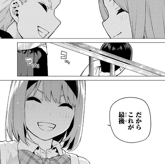 そしてこれが最後、と言った後、寝ぼけている風太郎に四葉はキスをします。