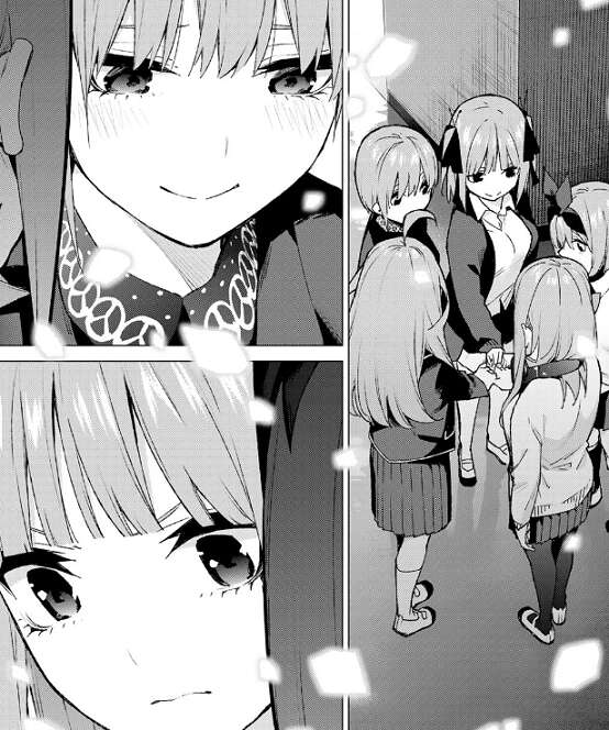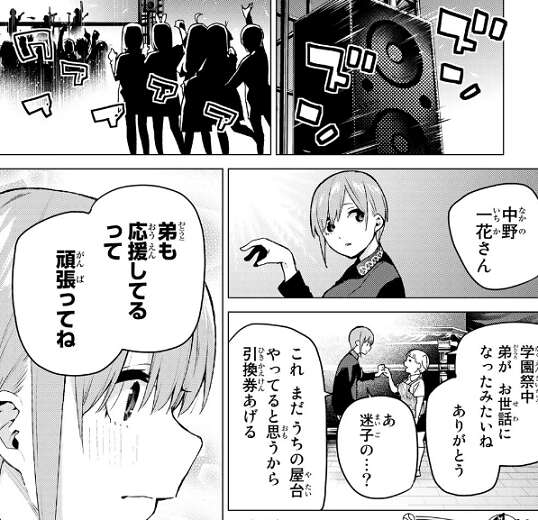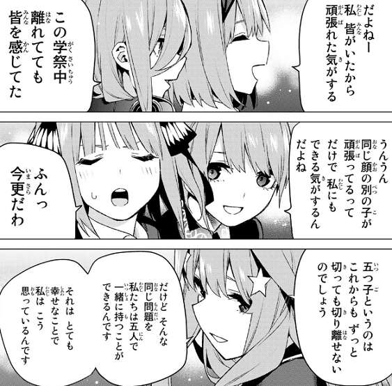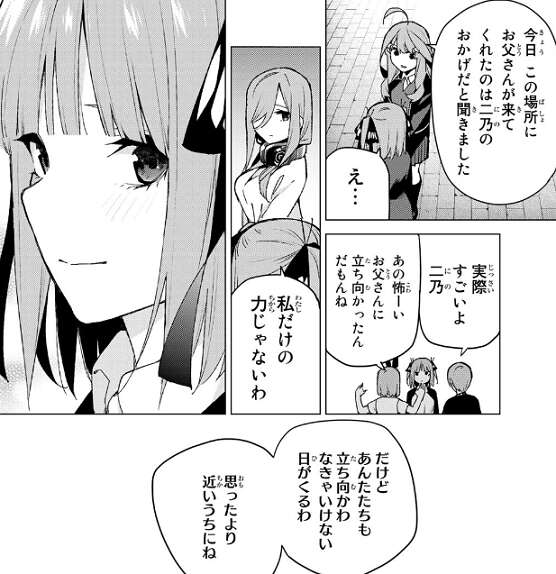 続いて二乃たちのクラスがやっていたパンケーキ屋を回りますが、既に皆は結果発表を見に行っているようで、屋台には誰もいません。五月は二乃にマルオがこの場所に来てくれたのは、二乃のおかげだとお礼を言い、一花や四葉もあの怖いお父さんにすごいと二乃を絶賛します。しかし、二乃は自分だけの力ではないと謙遜し、皆も立ち向かわなきゃいけない日が来ると言います。