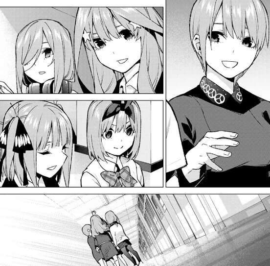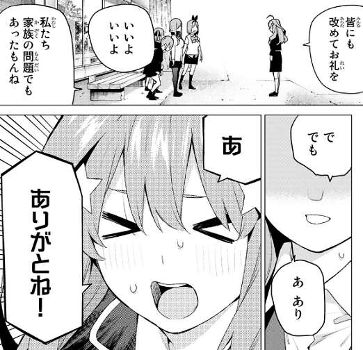 そこに五月が駆けつけてきて、前回の無堂の件のお礼を四人に伝えてます。前回から敬語を辞めた五月が「あ、ありがとね!」と言うと、なんか違和感しかないわと二乃から言われてしまいます。五月は三玖にも、自分の変装をして手伝ってくれた事にお礼を言いますが、三玖はあんなずさんな変装には満足していないと謎のプライドが芽生えています。