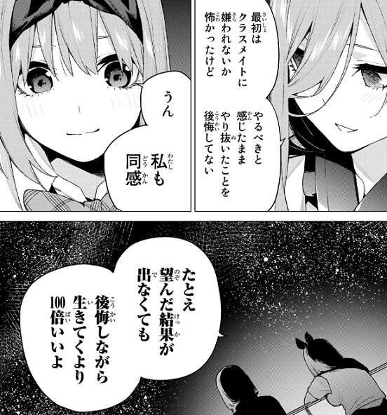最優秀店舗の発表では、四葉が手伝った演劇部や二乃や三玖が手伝ったパンケーキ屋が表彰されています。三玖と四葉は結果発表を見ながらお互いを祝福し、たとえ望んだ結果が出なくても、後悔しながら生きていくより100倍いいよと、自分がやるべきと感じたことをやり抜いたことに二人とも後悔していない様子です。