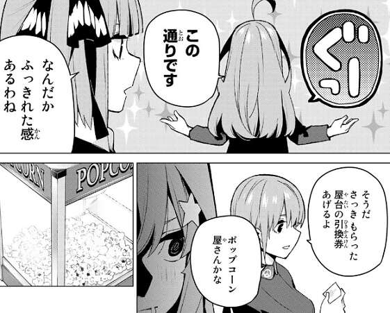 最後に五月の行きたいところを一花が聞きますが、五月は吹っ切れた様子でお腹を鳴らし食べ物がある屋台を希望します。一花がもらった屋台の引換券があるのでポップコーン屋に行くと、色々な味があり五月は迷ってしまいます。
