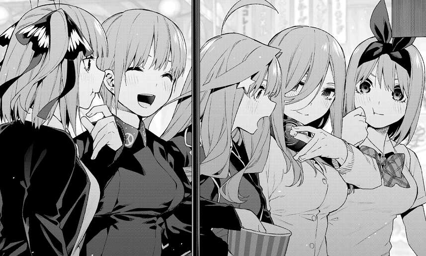 五人それぞれの学園祭を終えて後は後夜祭のみとなり、五月以外の四人が集まっています。後夜祭には五つ子、全員で回るようでどこに行くか話していますが、五つ子なので結局みんな同じ意見になると、二乃が突っこんでいます。