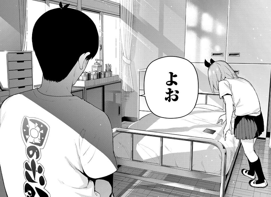 五月がこれからですよ 上杉君、と言った直後に、保健室のベッドでスマホを見つけた四葉とその四葉に話しかける風太郎が描かれます。