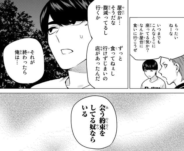 学園祭が終わる寂しさを感じながら、せっかくだからいつまでもこんなところに座っていないで屋台に食いに行こうと前田が言うと、風太郎も行けずじまいの店があったと賛成します。そして、それが終わったら俺は会う約束をしている奴がいると言います。