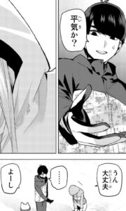 二乃に追いかけられ、四葉にまで見つかりかけます。ちょうどそこにかまくらの中で隠れている三玖助けられます。四葉の無尽蔵のスタミナの話から、三玖が四葉にはハンデをもらおうと言います。足の速さを平等にしてもらった方が盛り上がるとの事ですが、風太郎はそういうのはあまり好きじゃないと言います。四葉の運動能力は後天的なもので、本人の努力によるものだからその努力は否定したくないと言います。