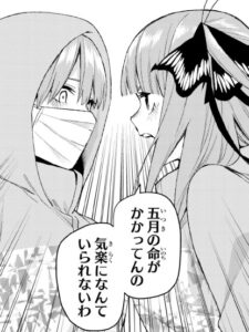 今回の話は三玖の悩みが晴れる二時間前の話です。一花を看病している五月ですが、旅館や倉庫で見た風太郎の怪しい行動に、五月はずっと警戒しているようです。