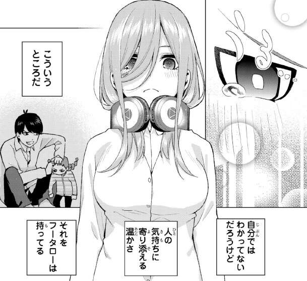 これを見て三玖は改めて、風太郎の人の気持ちに寄り添える温かさに溶かされていったのだと気づきます。