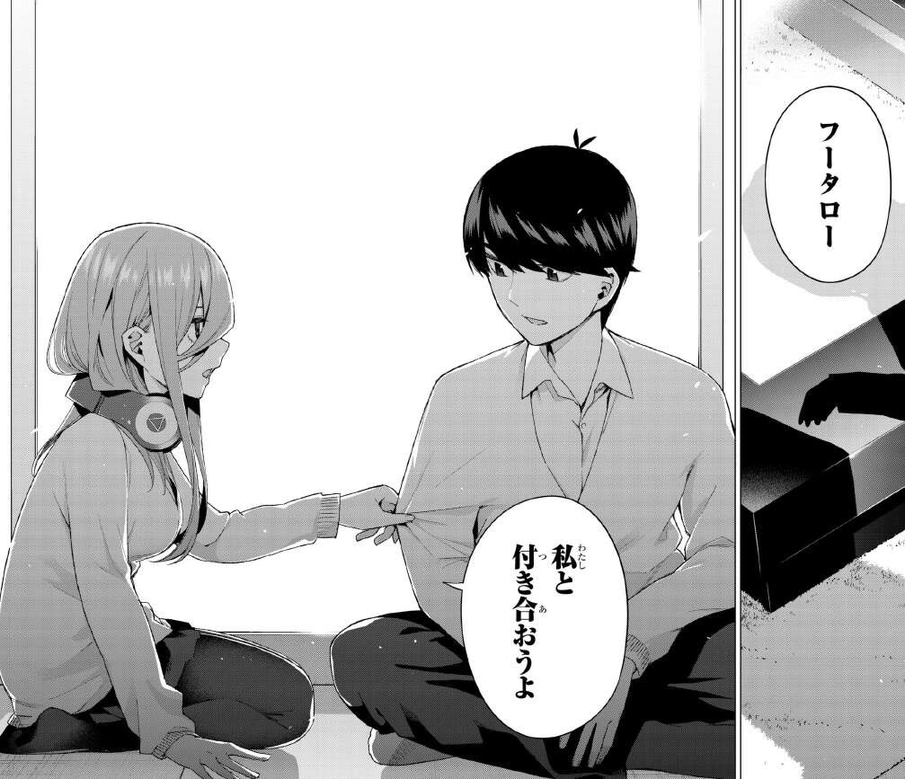 結局、三玖の告白は不発に終わりましたが、自分で本気だからと改めて一花に宣言します。しかし。